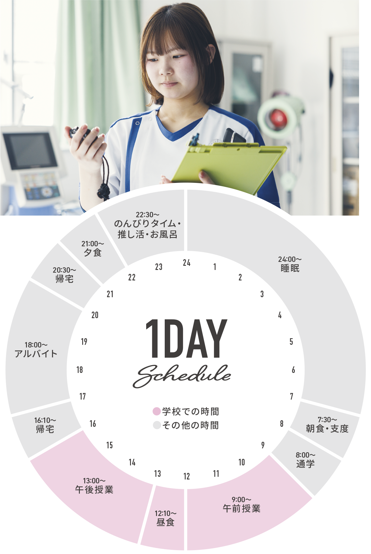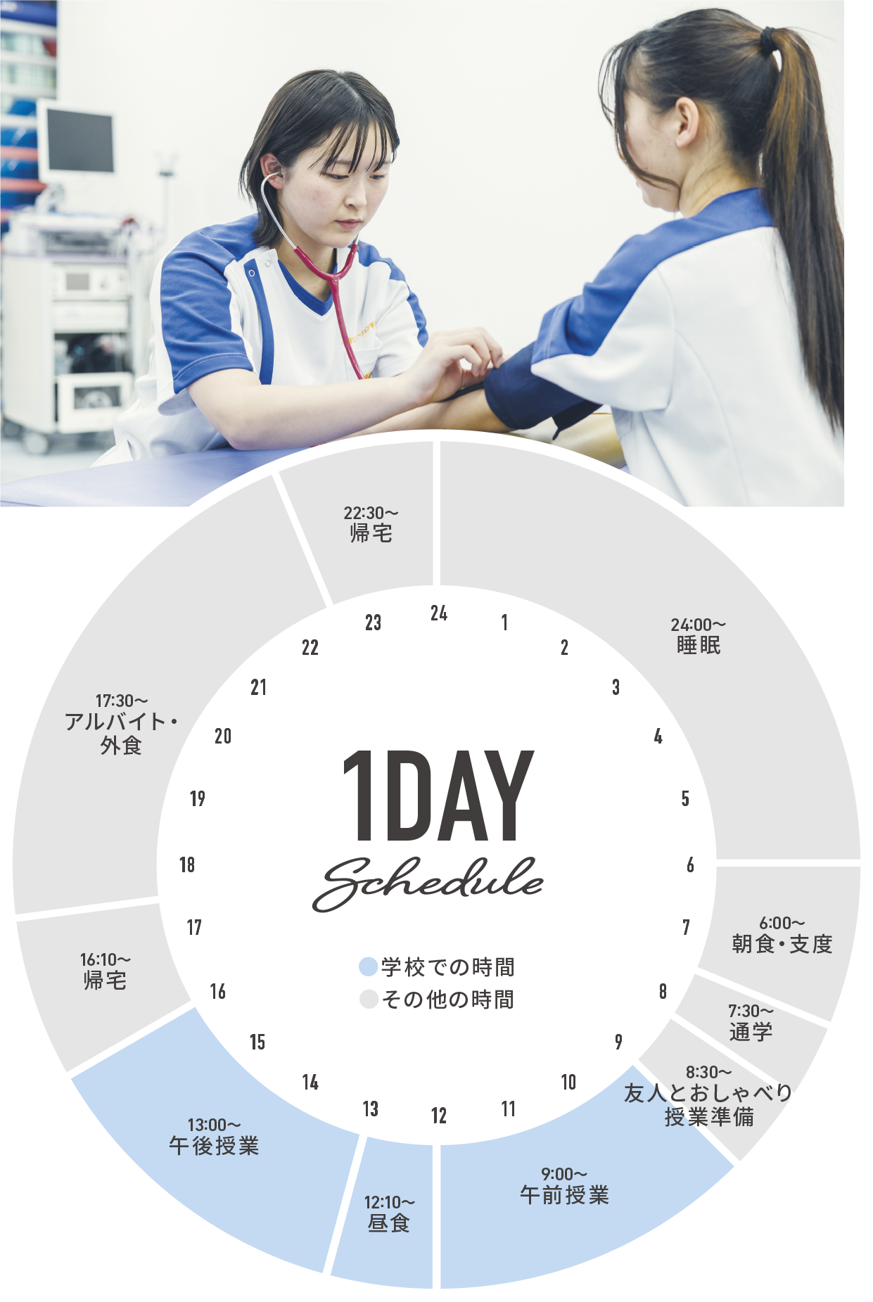 毎朝7時半のスクールバスに合わせて起床し、学業に励んでいます。バイトとの両立は大変ですが、授業では先生との距離が近く、分からないことはその場で質問できます。また、運動療法学演習では、様々なストレッチや筋トレを仲間と試し、「ここはもう少し伸ばした方がいいね」とお互い意見を交わすなど、共に学び、共に成長できる環境だから、知識がどんどん身についていく実感があります。